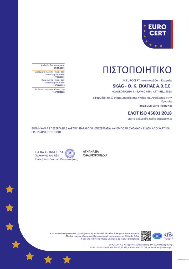 Στην πρώτη μολυβιά μιας ζωγραφιάς σε ένα μπλοκ, στο πρώτο γράμμα της αλφαβήτου που θα σχηματιστεί σωστά σε ένα τετράδιο, στην πρώτη σκέψη που θα γραφτεί σε ένα σημειωματάριο, στο ξεκίνημα κάθε προσπάθειας αλλά και στη συνέχεια της, η SKAG με τη διαχρονική της παρουσία είναι πάντα εκεί λειτουργώντας ως φορέας μάθησης, οργάνωσης, δημιουργικής έκφρασης και παιχνιδοενασχόλησης.